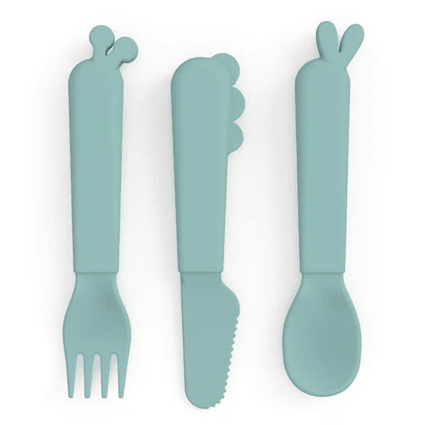 Das hübsche blaue Besteckset besteht aus einem Löffel mit Lalee-Ohren, einer Gabel mit Raffi-Ohren und einem Messer mit Croco-Schuppen. Es hat eine matte Oberfläche und passt perfekt zur restlichen Kiddish-Kollektion.