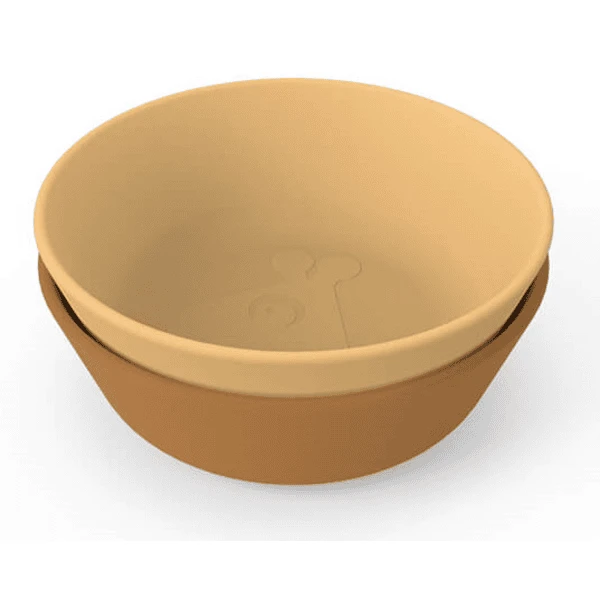 Aus der praktischen Kinderschüssel in Senfgelb blickt uns der süße Raffi
